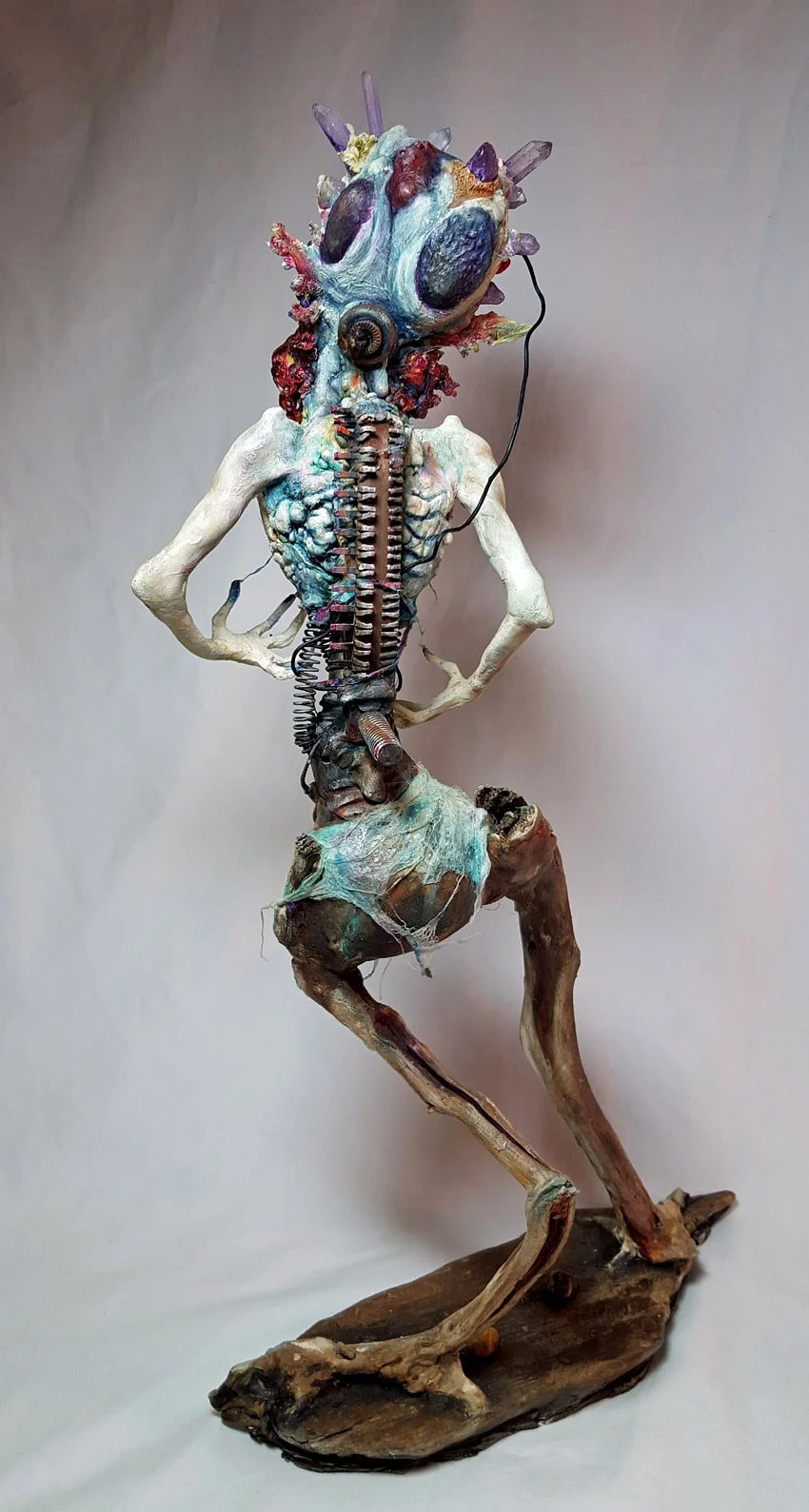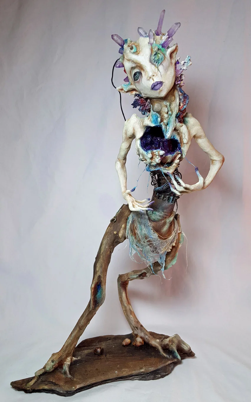 Paperclay, Gourd, Apoxie Sculpt, Driftwood, Flower Petals, Acrylics, Wire, Bark Pulp Paper, Glass Shards, Coral, Shells, Metal Findings, Springs, Gemstones: Amethyst and Quartz Crystals, Amethyst Stones, Tiger Eye, Quartz Cab.